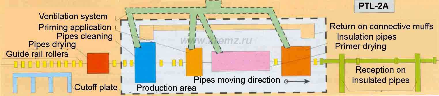 The PTL-2A line (completed) includes: device for pipes drying, cleaning machine, device for priming, camera for drying of the applied primer, device for insulating, device for receiving of the insulated pipes, driving and pressure supports, supports turning gear, device for the muffs return-ing, device for pipes loading, lift, cutting device, hydraulic system, ventilation system. In accor-dance with using insulation type and Customer order, the complete line can be changed.
