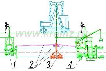 Опоры устанавливаются на рамы грунтовочной и изоляционной машин, а также на троллейную подвеску сопровождения изоляционной машины. На катушки наматывается полотно покрытия.